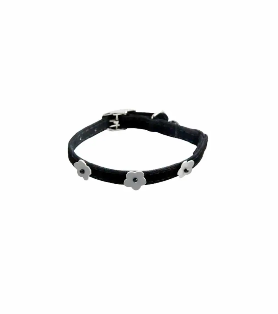 Confeccionada em veludo suave, decorada com pequenas flores, esta coleira oferece um toque único e delicado, sem causar irritação à pele do teu amigo felino.