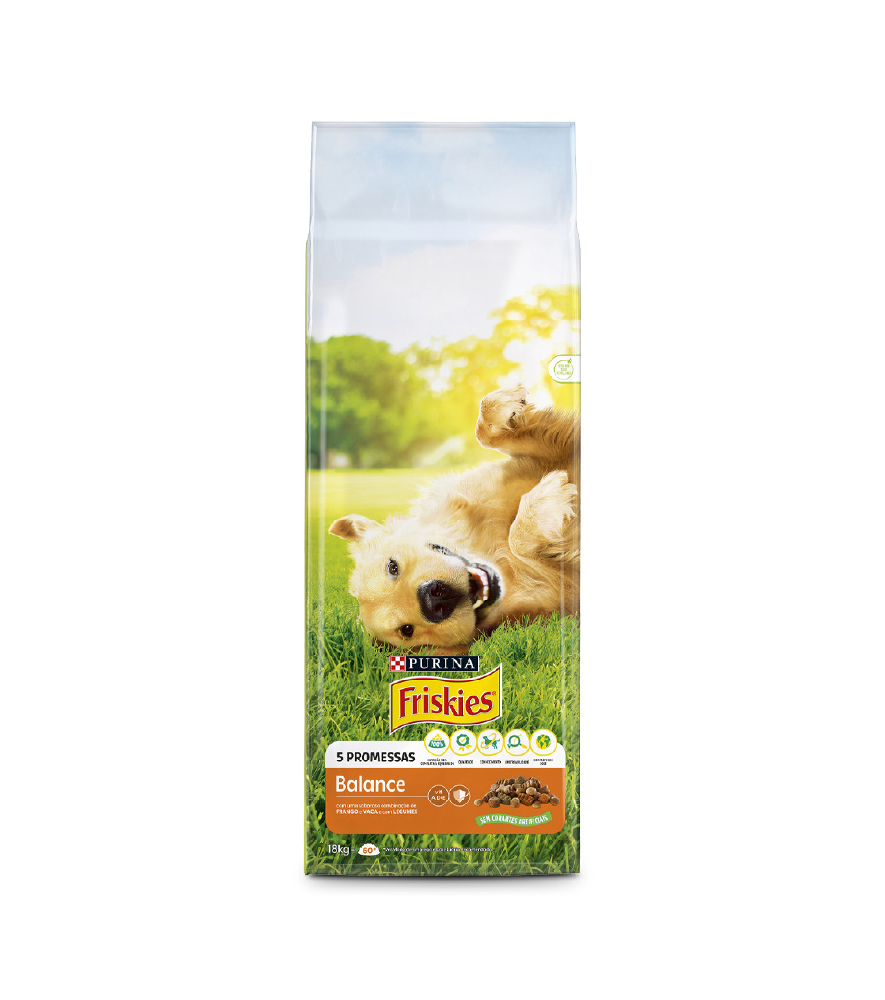 Ração seca Friskies Balance com frango para cães adultos. Nutrição completa, sem corantes ou conservantes artificiais. Bem-estar e vitalidade diária.