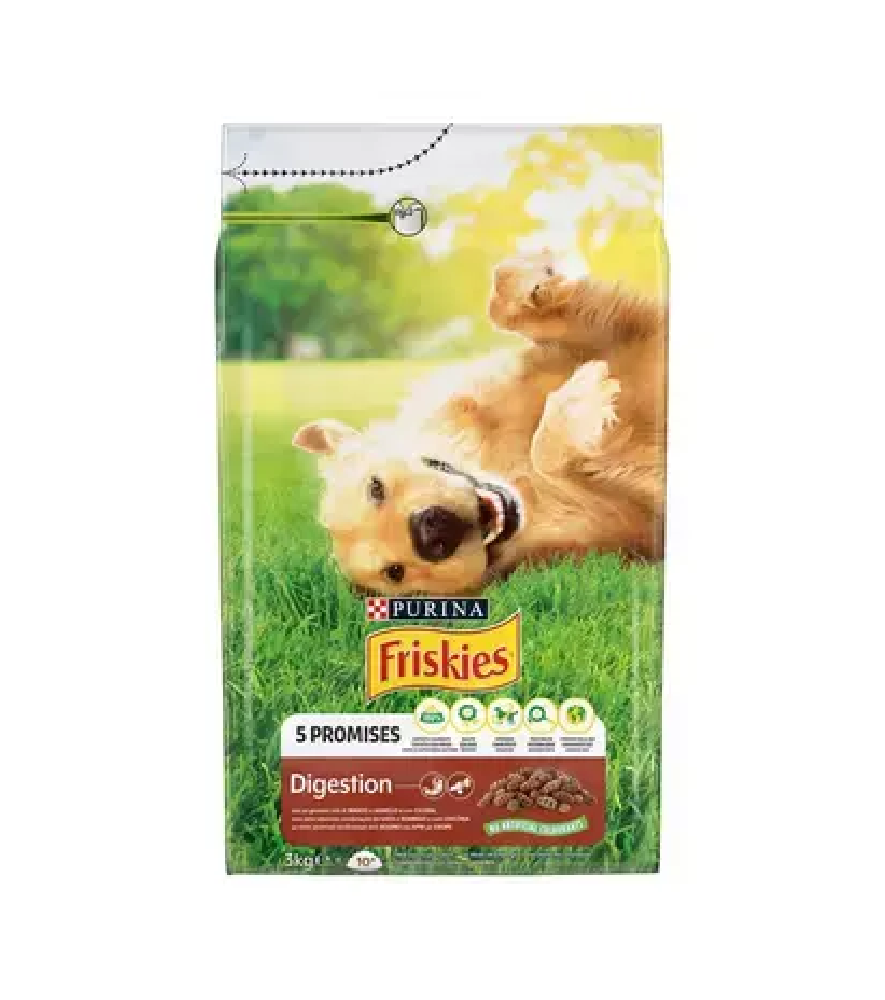 Ração Friskies Digestion com vaca e borrego, ideal para cães com digestão sensível. Nutrição equilibrada, sem aditivos artificiais.
