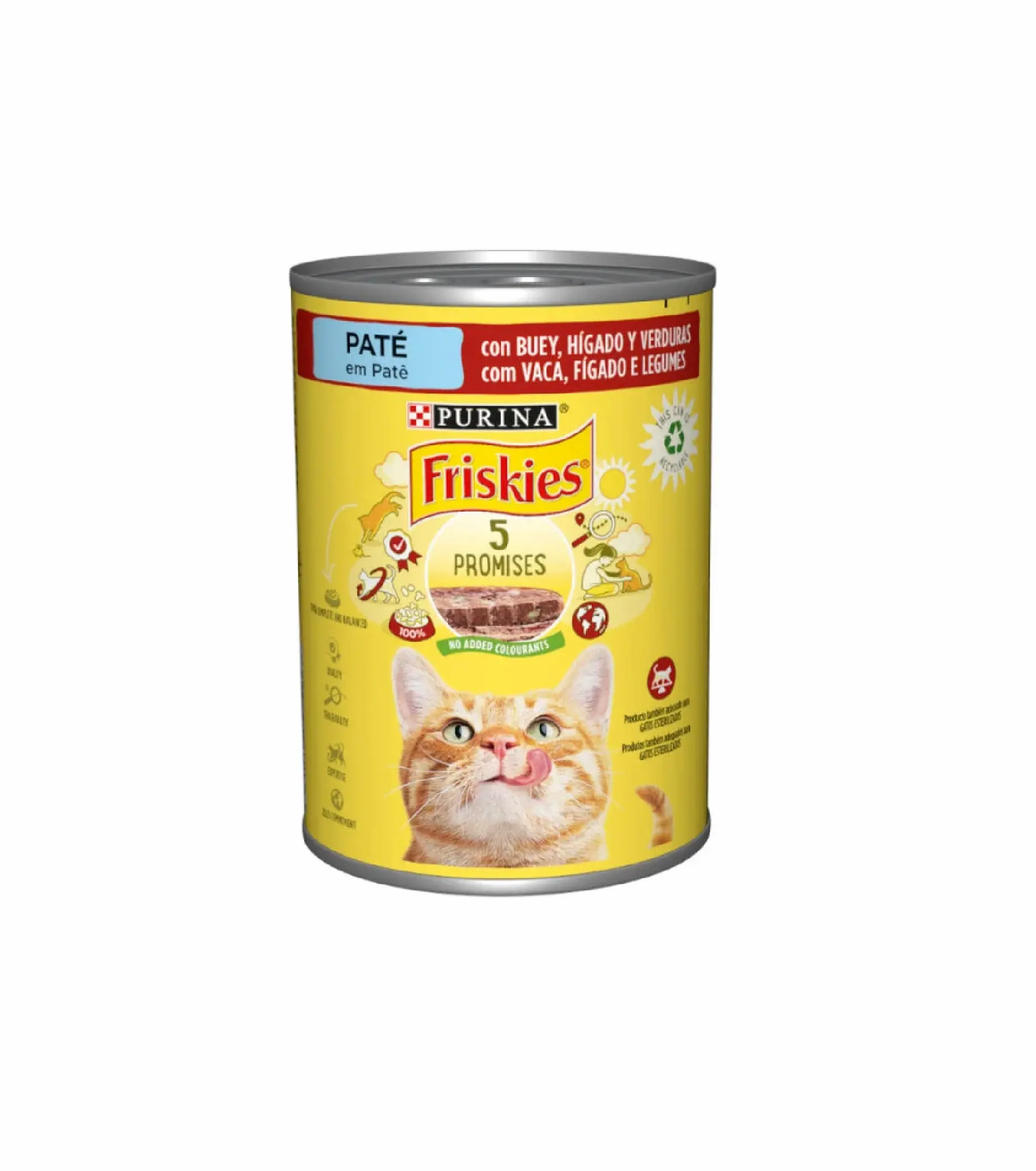 A comida húmida para gato Friskies Vaca, Fígado e Legumes foi desenvolvida para proporcionar ao teu felino uma refeição deliciosa, equilibrada e cheia de vitalidade.