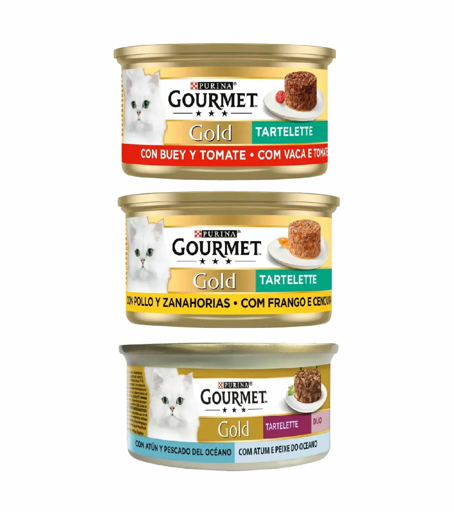 Gourmet Gold Tartelette: Perfeita para gatos que preferem texturas de tartelette com pedaços suculentos. Feita com carne e legumes naturais, sem aditivos artificiais.