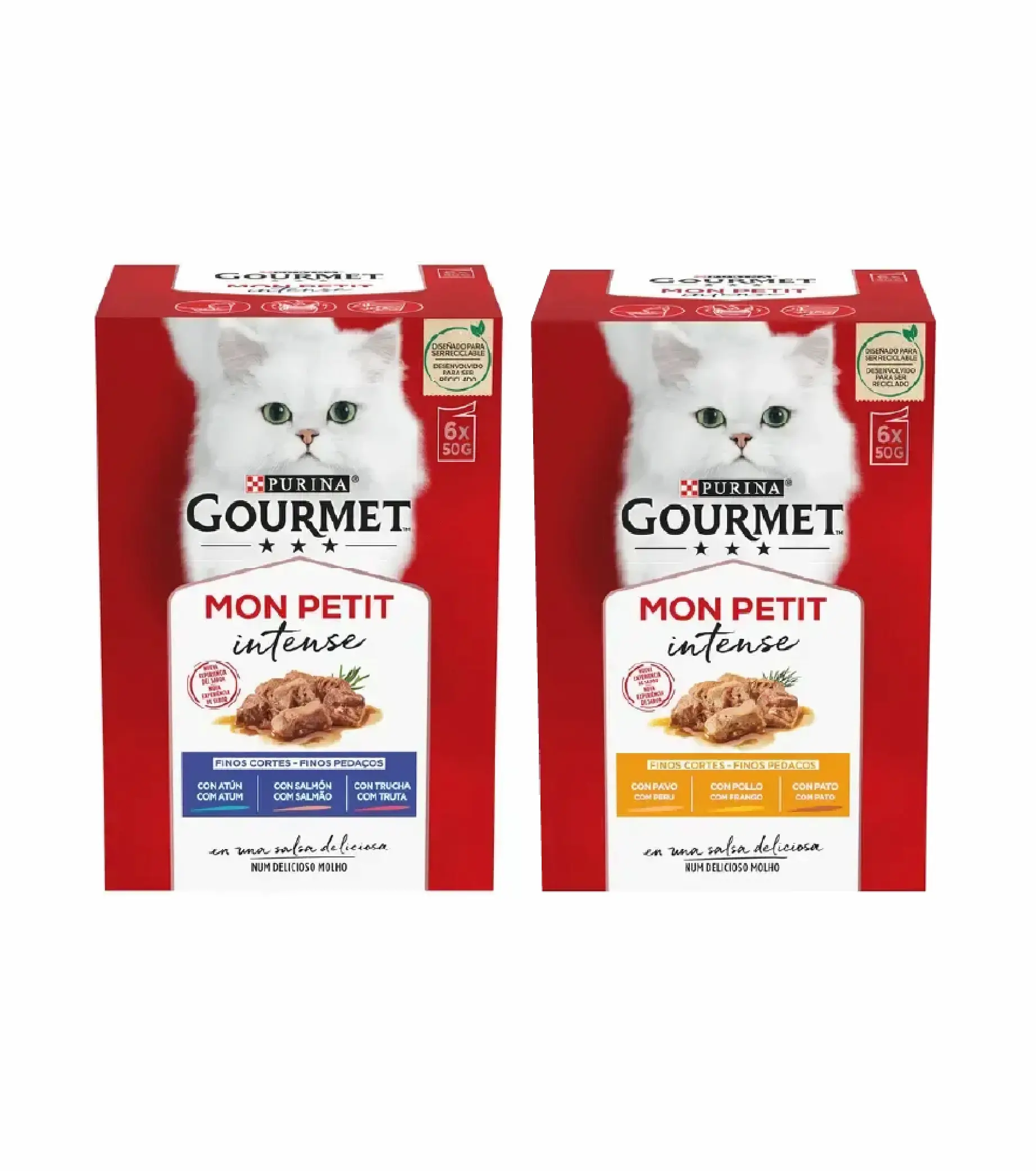 Gourmet Mon Petit Intense em práticas saquetas de 50g garante frescura, sabor intenso e nutrição equilibrada. Uma refeição saudável e irresistível para o teu gato.