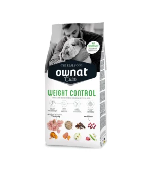 Ownat Care Weight Control — ração para cão natural e equilibrada, com baixo teor de gordura, fibras saciantes e ingredientes que protegem articulações.