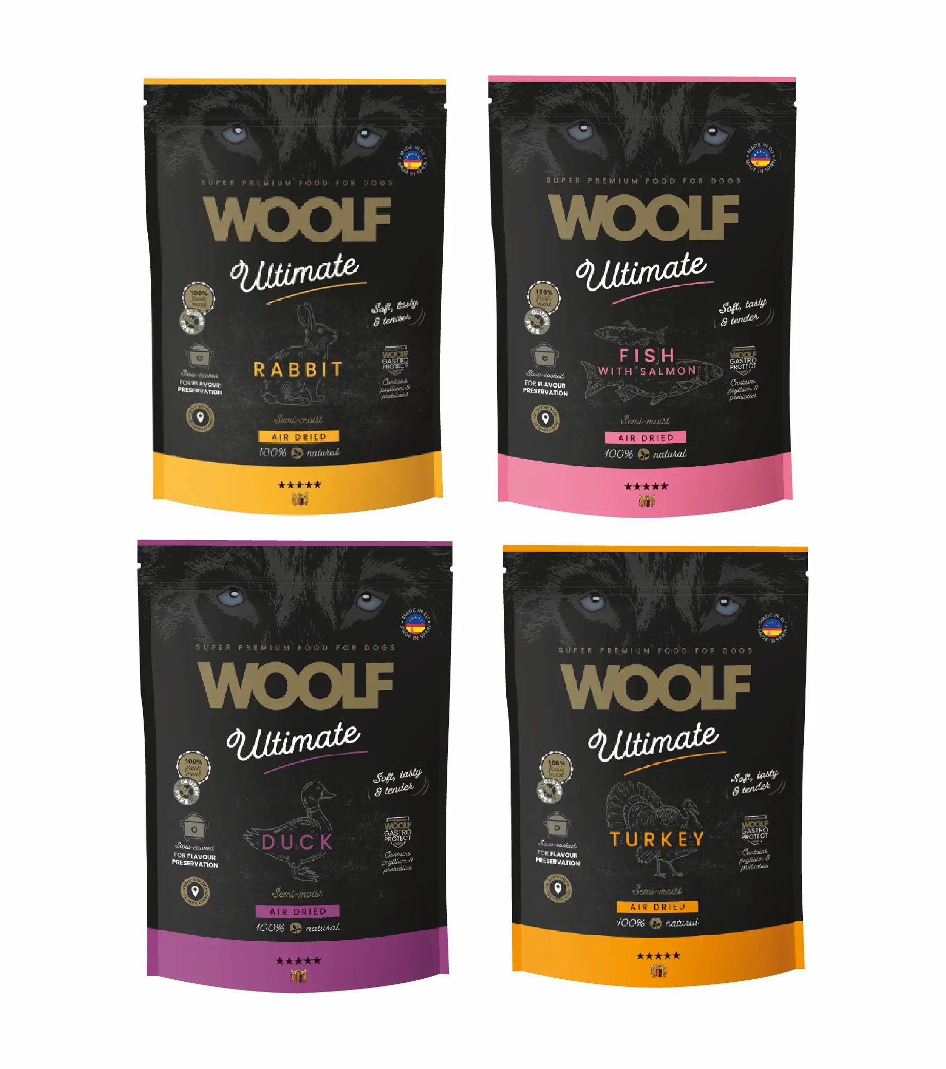 Woolf Ultimate Peixe e Salmão: Peixe fresco 55% (salmão 22%), pato fresco 20%, peru fresco 10%, amido hidrolisado, glicerina, polpa de beterraba, cominho, Woolf Gastroprotect (óleos essenciais (cravo, tomilho, orégano, canela, alecrim), B-Glucanos e Manaoligossacarídeos (MOS) extraídos de Saccharomyces cerevisiae), vinagre tamponado.