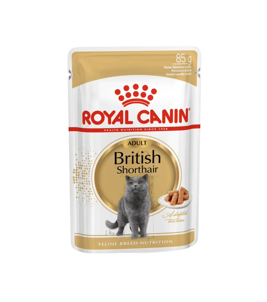 A Royal Canin British Shorthair ração húmida completa para gatos. Especial para gatos British Shorthair adultos – Com mais de 12 meses (pequenos pedaços com molho)