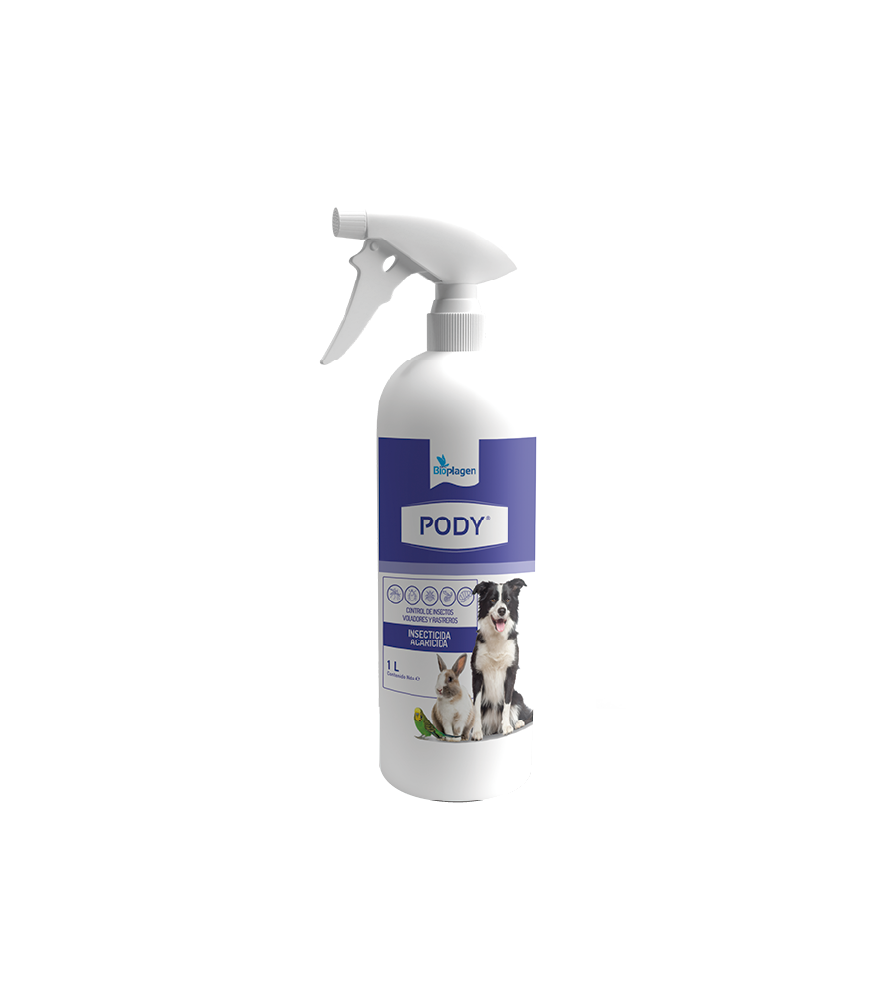 Agita bem antes de usar. Pulveriza o Spray Inseticida Acaricida – Pody Care diretamente nas áreas infestadas ou nos locais onde os insetos se escondem e circulam (como cantos, rodapés e zonas de repouso dos animais). Aplica sem diluir, com uma frequência semanal ou conforme necessário.