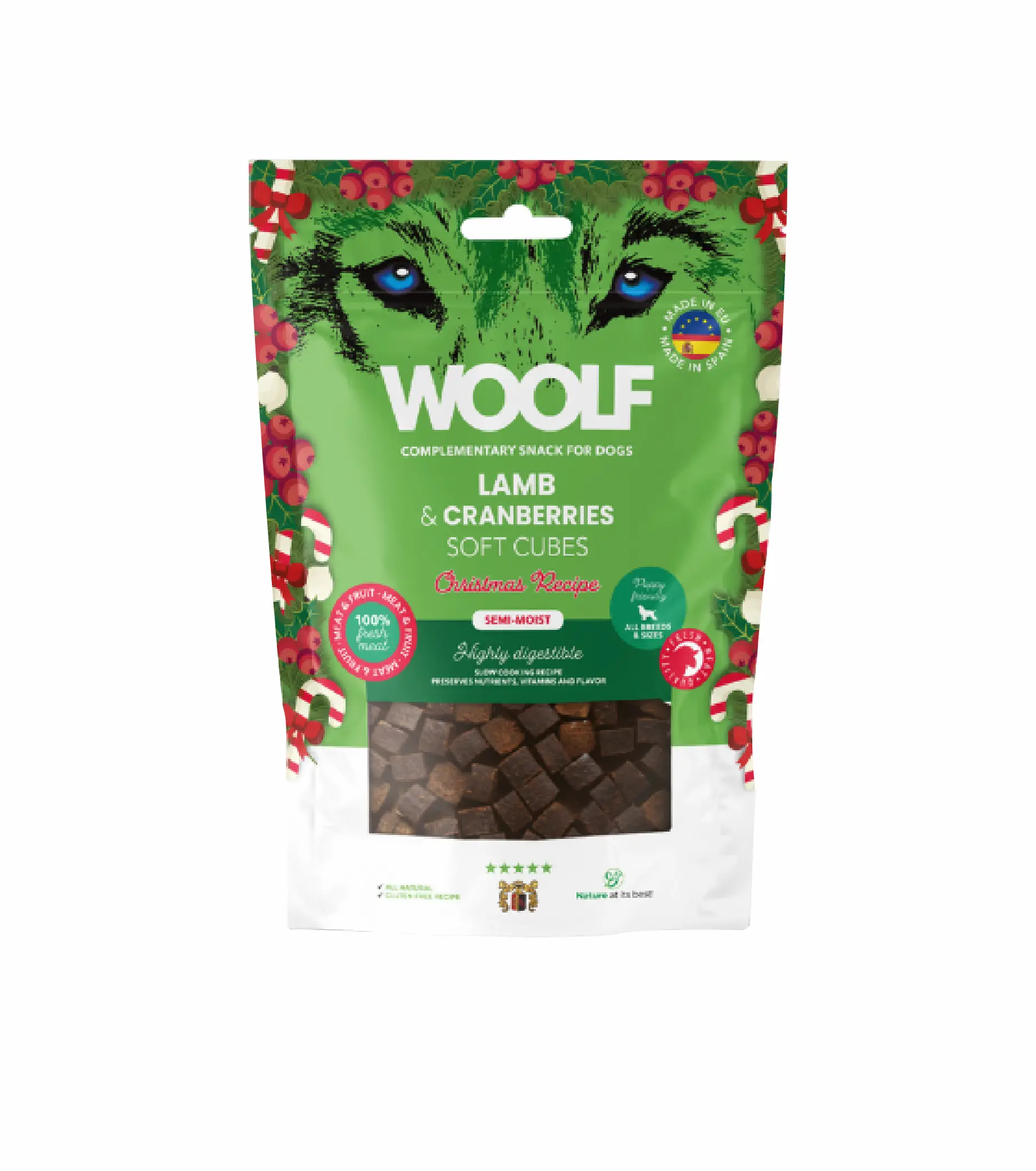 Woolf Semihúmido Cordeiro com Mirtilos, delicioso snack 100% natural, sem cereais nem aditivos. Ideal para cães de todas as idades, com textura macia e sabor irresistível.